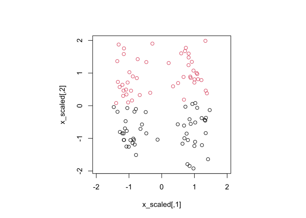 km_scaled <- kmeans(x_scaled, centers = 2)