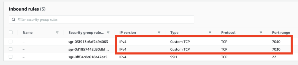 But when you set up an SSH tunnel you will also need to make sure the EC2 instance accepts SSH traffic on the ports that will be opened by the tunnel. These are up to you; I have created two tunnels, one on port 7030 and one on 7040, so navigate to the settings for the security group of your instance and make sure the instance will accept TCP traffic to these ports: